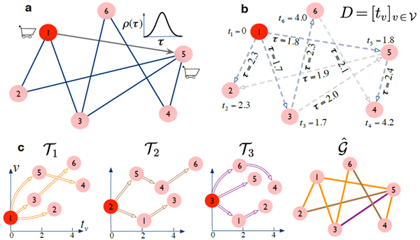 圖2:a.隨機時效網(wǎng)絡(luò)零模型; b. 隨機時效網(wǎng)絡(luò)上的擴散過程; c. 隨機時效網(wǎng)絡(luò)的拓撲推斷過程示例