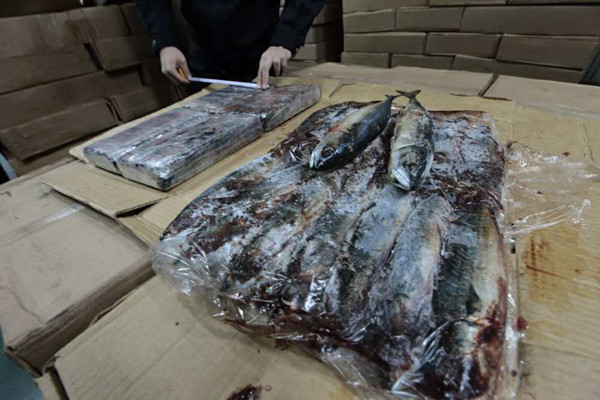 據(jù)透露,中、美兩國海關(guān)在國際合作中鎖定一條可疑單證信息,上海海關(guān)隨即下達(dá)查驗(yàn)布控指令。2016年11月4日,上海洋山海關(guān)關(guān)員根據(jù)指令對一批申報(bào)品名為“太平洋馬鮫魚凍品”的集裝箱貨物實(shí)施查驗(yàn)。這批凍魚重約 20噸,為國際中轉(zhuǎn)貨物,集裝箱從南美裝船出港,經(jīng)上海洋山深水港中轉(zhuǎn)至柬埔寨。為了防止凍魚在查驗(yàn)過程中解凍變質(zhì),海關(guān)查驗(yàn)在冷鏈倉庫中進(jìn)行,量大、低溫加上濃重的魚腥味,都大大增加了海關(guān)關(guān)員的查驗(yàn)難度。