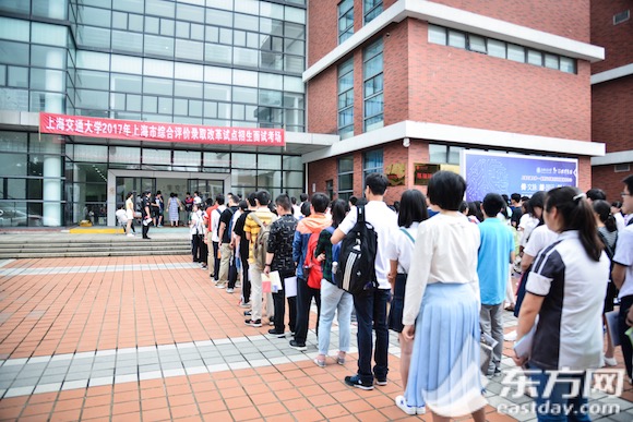 圖片說明:參加上海交通大學2017年綜合評價錄取改革試點校測面試的考生們,正在考場外列隊有序等待進入。魏楨琦攝