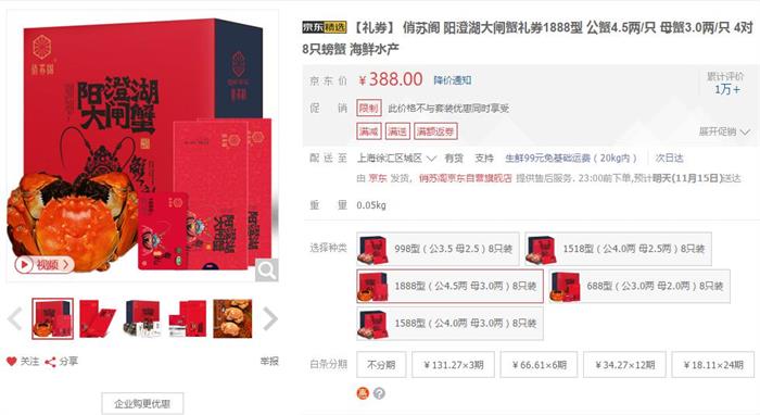 目前在售的蟹券品類繁多,價格差距較大。蟹券通常會標(biāo)稱1888型、2388型、2588型,電商平臺的商品參考價、劃線價格,以及券面標(biāo)稱價格很高,然而實際銷售差價較大。如天貓、京東等平臺的蟹券產(chǎn)品,劃線價格標(biāo)稱面值高達數(shù)千元,實際售價卻只有幾百元。