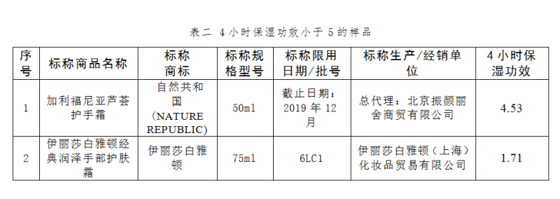 檢測結(jié)果發(fā)現(xiàn), 以4小時(shí)保濕功效為例,27件樣品最高的為25.22,最低的為1.71,保濕效果差異明顯。其中4件樣品的數(shù)值在20以上,保濕效果上佳(見表一);10件樣品在15至20之間;9件樣品在10至15之間;2件樣品在5至10之間;2件樣品在5下,保濕效果一般(見表二)。