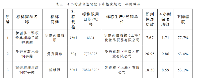 消費(fèi)者在使用護(hù)手霜時(shí)常會(huì)遇到剛開始涂抹時(shí),保濕效果非常好,但沒過多久,保濕效果就會(huì)降低。這是因?yàn)樽o(hù)手霜保濕成份持有的水分會(huì)隨著時(shí)間推移而蒸發(fā),保濕功效隨之下降。但不同護(hù)手霜的保濕時(shí)效有所不同。本次比較試驗(yàn)在對(duì)27件樣品的即刻保濕功效和4小時(shí)保濕功效的對(duì)比中發(fā)現(xiàn),有些樣品的4小時(shí)保濕功效相比它的即刻保濕功效只是略有下降;但也有部分樣品雖然涂抹后即刻保濕效果較好,但4小時(shí)后保濕功效下降明顯, 有3件樣品的下降幅度甚至超過一半以上(見表三)。