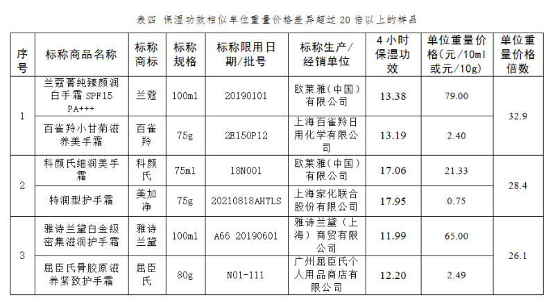 部分保濕功效相似的樣品單位重量價(jià)格差異較大