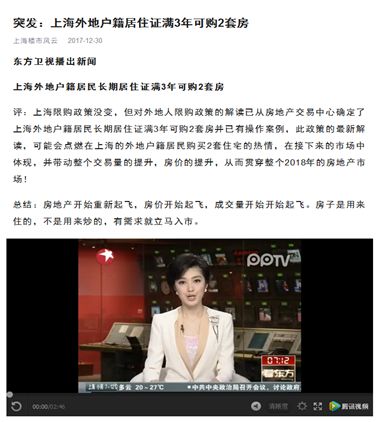 2017年12月30日,上海網(wǎng)警在公開巡查執(zhí)法中發(fā)現(xiàn),微信公眾號“上海樓市風云”發(fā)布了題為《突發(fā):上海外地戶籍居住證滿3年可購2套房》的文章,文中杜撰“東方衛(wèi)視播出新聞,上海外地戶籍居民長期居住證滿3年可購2套房”、“此政策的最新解讀,可能會點燃在上海的外地戶籍居民購買2套住宅的熱情,在接下來的市場中體現(xiàn),并帶動整個交易量的提升,房價的提升,從而貫穿整個2018年的房地產(chǎn)市場”等內(nèi)容,并添加了新聞視頻片段,以提高其可信度。