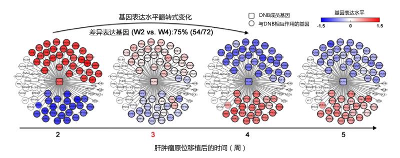 圖片說(shuō)明:從網(wǎng)絡(luò)層次展示了關(guān)鍵基因CALML3及其相互作用基因的表達(dá)水平在肝癌肺轉(zhuǎn)移發(fā)生過(guò)程中的動(dòng)態(tài)變化。紅色和藍(lán)色分別代表基因表達(dá)水平高和低,可以清楚地看到第三周(即臨界階段)的前后表達(dá)水平呈現(xiàn)翻轉(zhuǎn)式變化。