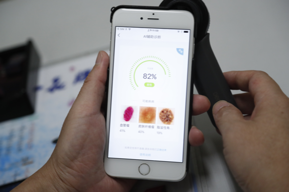記者在蔡醫(yī)生的門診中看到,他用手持式皮膚鏡給患者身上的一處“色斑”拍攝照片,然后上傳到手機上一款應用程序(APP)中,程序立即給出了良惡性判斷及輔助診斷的疾病名稱。隨后,他在應用程序的頁面里繼續(xù)輸入患者的主訴、臨床表現(xiàn)等文字信息,按下提交按鈕,十幾分鐘后,頁面上出現(xiàn)了來自華山醫(yī)院皮膚科專家給出的診斷建議。