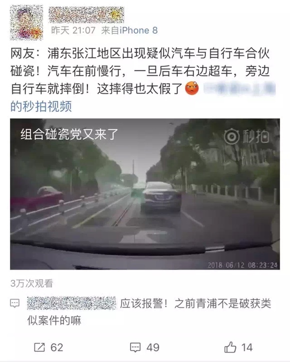 “浦東張江地區(qū)出現(xiàn)疑似汽車與自行車合伙碰瓷!汽車在前慢行,一旦后車后邊超車,旁邊自行車就摔倒!”近期,有不少網(wǎng)友在網(wǎng)上發(fā)帖揭露新型碰瓷套路。