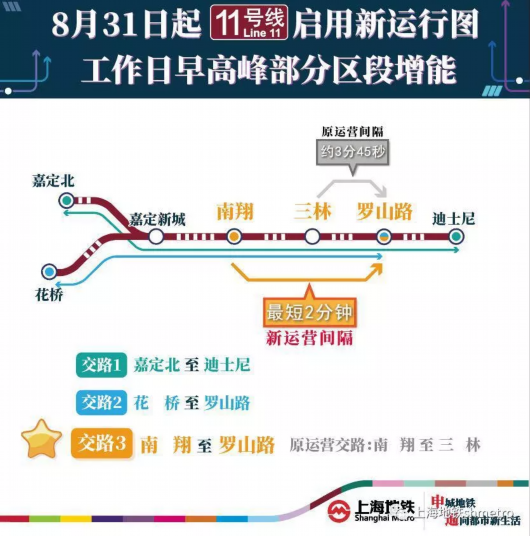 同時,11號線運(yùn)行交路由原先的“南翔站~三林站/花橋站~羅山路站/嘉定北站~迪士尼站”調(diào)整為“南翔站~羅山路站/花橋站~羅山路站/嘉定北站~迪士尼站”。