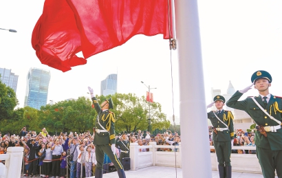 昨天6時(shí)30分,上海市人民廣場(chǎng)花團(tuán)錦簇,人頭攢動(dòng),處處洋溢著節(jié)日氛圍,武警上?傟(duì)執(zhí)勤四支隊(duì)十中隊(duì)隆重舉行升旗儀式,用軍人最莊嚴(yán)的禮儀為祖國(guó)慶生。