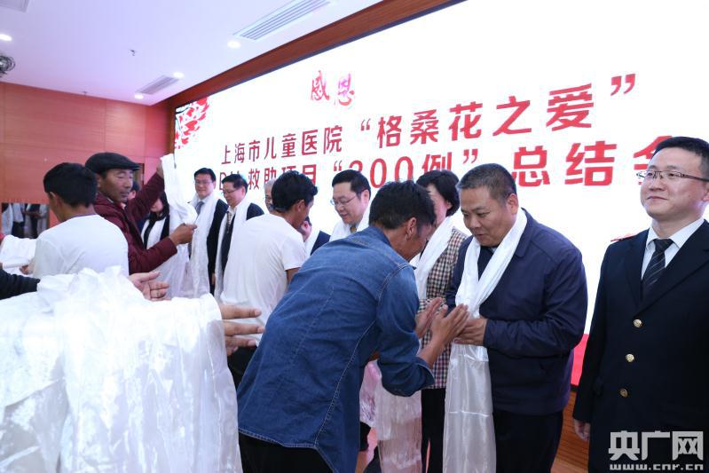 第38批藏區(qū)來滬患兒家屬為現(xiàn)場領(lǐng)導(dǎo)、嘉賓、醫(yī)務(wù)人員和愛心人士獻上潔白的哈達(央廣網(wǎng)發(fā) 上海市兒童醫(yī)院 供圖)