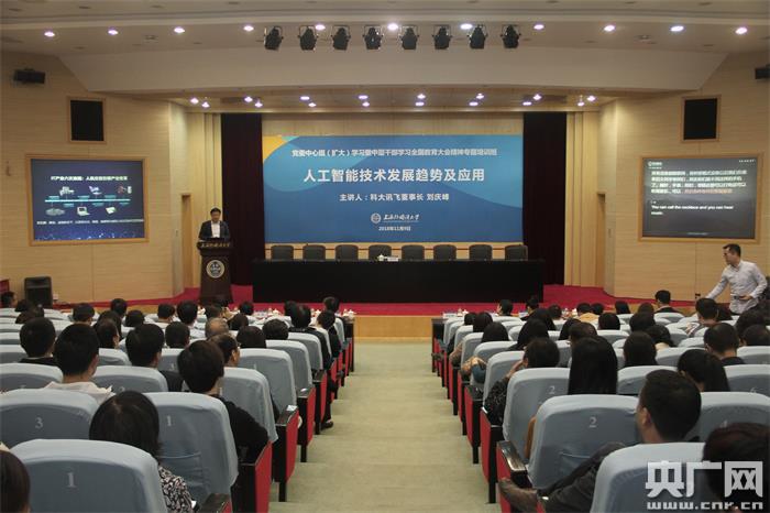 科大訊飛董事長劉慶峰在上海外國語大學(xué)為黨委中心組做“人工智能技術(shù)發(fā)展趨勢及應(yīng)用”專題報告。(央廣網(wǎng)發(fā) 上海外國語大學(xué) 供圖)