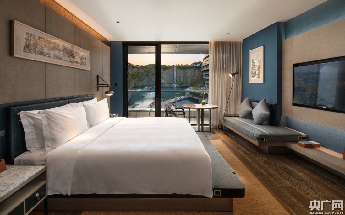 又名世茂深坑酒店,建筑格局為地上2層、地平面下16層(其中水面以下兩層),共有336間客房和套房,所有客房均設(shè)有觀景露臺(tái),面向深坑,觀賞峭壁瀑布絕景。