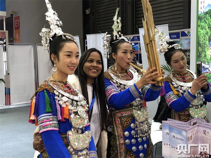 外國(guó)參觀者與彝族表演者合影。(央廣記者 楊靜 攝)