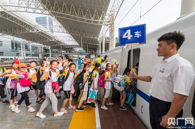 一群小朋友旅客在常州站客運(yùn)人員引導(dǎo)下有序上車(chē)。 (央廣網(wǎng)發(fā) 李忱 攝)