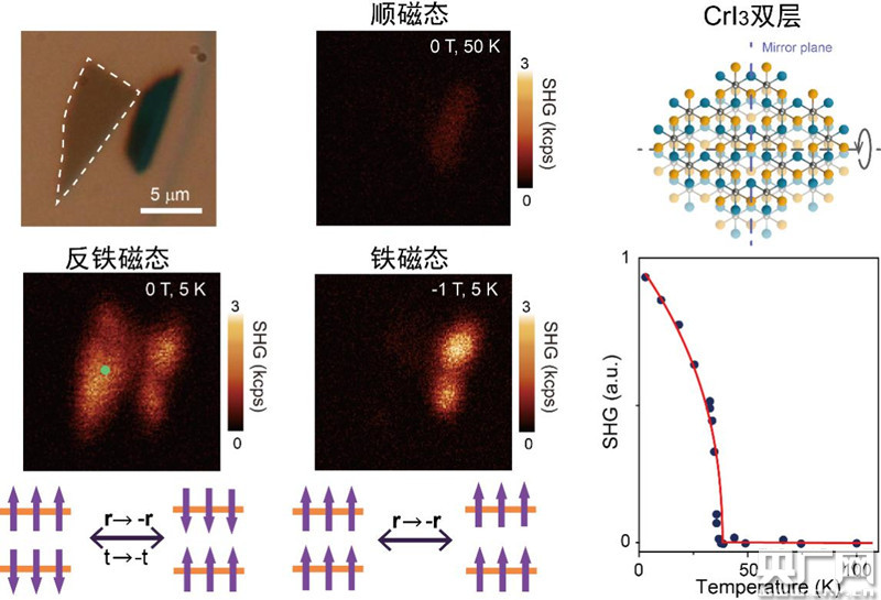 光學(xué)二次諧波過(guò)程對(duì)體系的對(duì)稱性高度敏感,光學(xué)二次諧波的探測(cè)方法從體系的對(duì)稱性入手,能夠靈敏地探測(cè)體系的反鐵磁性。與通常探測(cè)磁性的實(shí)驗(yàn)手段不同,它不依賴于材料的宏觀磁性,而取決于微觀磁結(jié)構(gòu)造成的對(duì)稱破缺。雙層三碘化鉻在反鐵磁態(tài)下,其磁結(jié)構(gòu)不但打破了時(shí)間反演對(duì)稱性,也同時(shí)打破了空間反演對(duì)稱性,由此產(chǎn)生強(qiáng)烈的非互易二次諧波響應(yīng)。當(dāng)體系升至轉(zhuǎn)變溫度以上、或施加面外磁場(chǎng)拉為鐵磁態(tài)后,磁結(jié)構(gòu)的對(duì)稱性卻發(fā)生了改變,這一二次諧波信號(hào)也隨之消失。