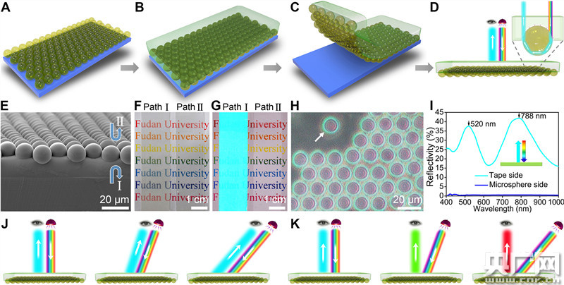 圖1. 逆反射結(jié)構(gòu)色薄膜的(A-D)制備步驟, (E-I)結(jié)構(gòu)和光學(xué)特性,以及(J)照明/觀察同軸時隨角不變色和(K)照明/觀察不同軸時隨角變色的示意圖。