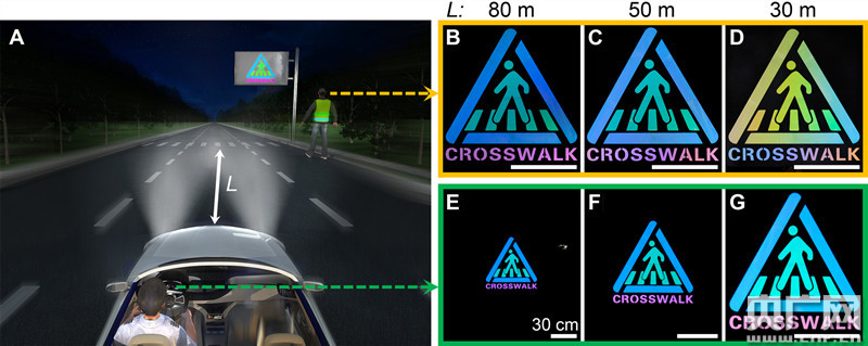 圖2.(A)逆反射結(jié)構(gòu)色薄膜制備的交通反光標(biāo)牌在夜間道路上應(yīng)用的示意圖,以及車輛距離標(biāo)牌不同距離L時(80米、50米、30米)(B-D)行人視角和(E-G)司機(jī)視角的照片。