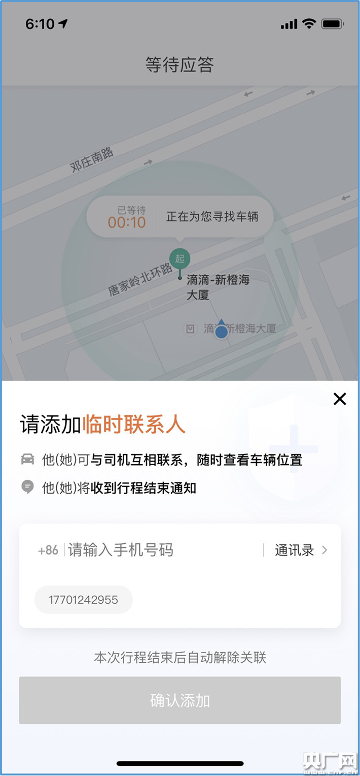 平臺(tái)將引導(dǎo)乘客添加臨時(shí)聯(lián)系人(央廣網(wǎng)發(fā) 滴滴提供)