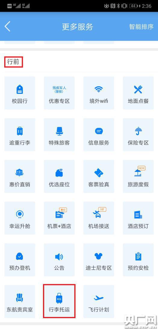 2.進(jìn)入【行前】界面,點(diǎn)擊【行李托運(yùn)】