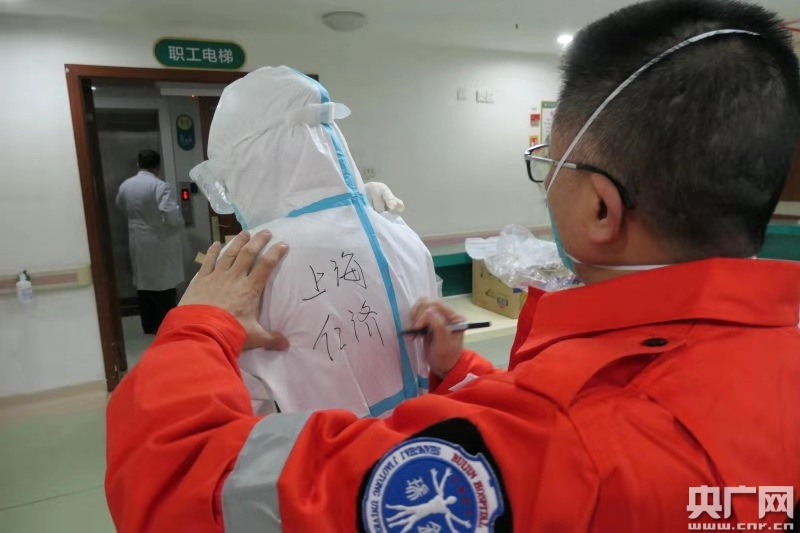 陳爾真教授特地在我們每個(gè)人背上寫下我們的醫(yī)院和名字,為我們鼓勁兒、加油(本文圖片:央廣網(wǎng)發(fā) 仁濟(jì)醫(yī)院南院供圖)