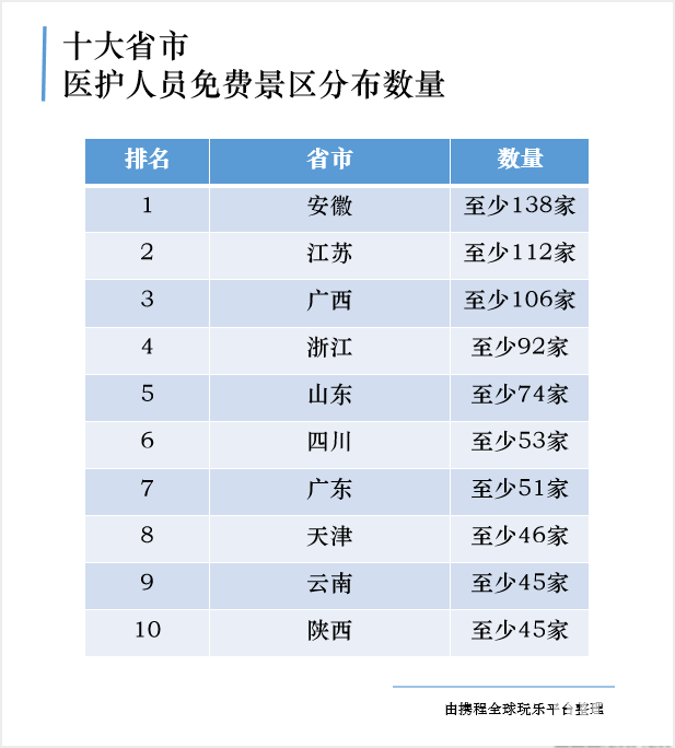 攜程還公布了對(duì)醫(yī)護(hù)人員免費(fèi)景區(qū)最多的十大省份,前十名分別是安徽、江蘇、廣西、浙江、山東、四川、廣東、天津、云南和陜西。前三名的省份,提供醫(yī)護(hù)人員優(yōu)待政策的景區(qū),均超過(guò)一百家,安徽以138家優(yōu)待景區(qū)排名第一,江蘇、廣西以112家、106家緊隨其后。