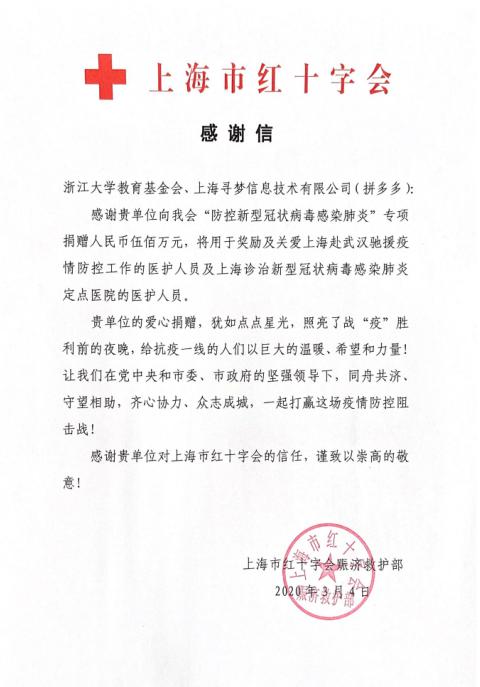 3月4日,上海市紅十字會(huì)給拼多多和浙江大學(xué)發(fā)來(lái)感謝信,感謝兩家單位為醫(yī)護(hù)工作人員帶來(lái)的500萬(wàn)元專(zhuān)項(xiàng)捐贈(zèng)。