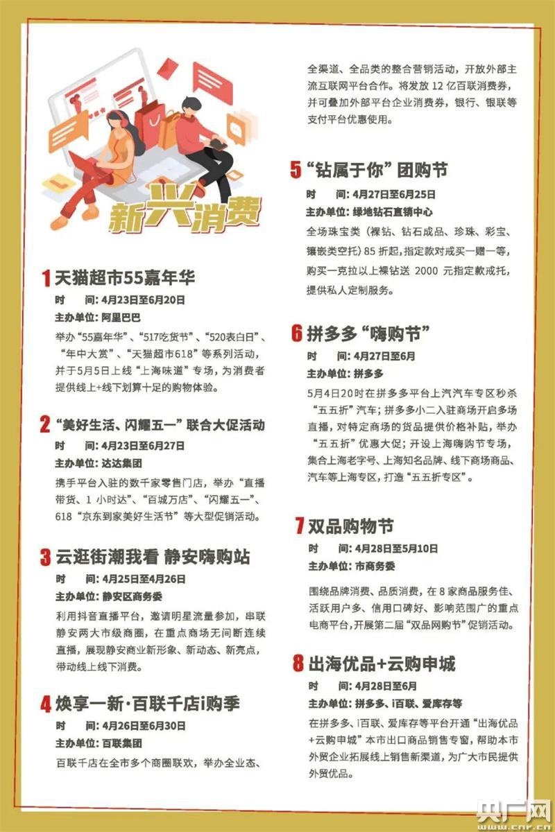 新興消費方面,將推出近30項重點活動,如阿里巴巴將打造“55聚劃算匯聚上海”專屬會場,開展打折、發(fā)放大額優(yōu)惠券等讓利活動,涉及1000家本地生活品牌、42萬家淘寶天貓上海商家。