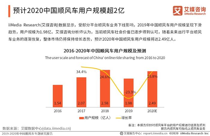 iiMedia Research(艾媒咨詢)數(shù)據(jù)顯示,受部分平臺(tái)順風(fēng)車業(yè)務(wù)下線影響,2019年中國(guó)順風(fēng)車用戶規(guī)模呈現(xiàn)下滑趨勢(shì),用戶規(guī)模為1.98億。艾媒咨詢分析師認(rèn)為,順風(fēng)車憑借價(jià)格實(shí)惠、舒適便捷、共享環(huán)保的優(yōu)勢(shì)滿足用戶個(gè)性、多元的出行需求。隨著順風(fēng)車行業(yè)安全建設(shè)的推進(jìn)及平臺(tái)服務(wù)的升級(jí),在不同生活場(chǎng)景下,用戶對(duì)順風(fēng)車的需求日益增多。當(dāng)前順風(fēng)車社會(huì)價(jià)值已逐步得到認(rèn)可,隨著未來(lái)出行平臺(tái)順風(fēng)車業(yè)務(wù)的逐漸恢復(fù), 整體市場(chǎng)仍將保持增長(zhǎng)態(tài)勢(shì),預(yù)計(jì)2020年中國(guó)順風(fēng)車用戶規(guī)模將達(dá)2.49億人。