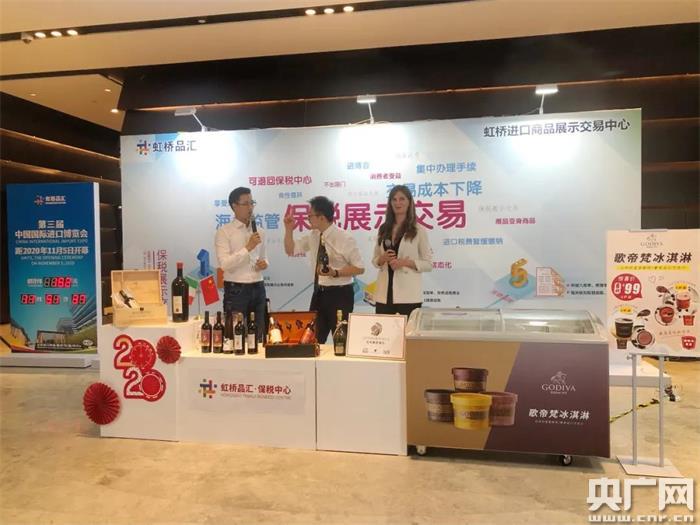 在一街之隔的虹橋品匯線下直播間,主持人已經(jīng)品嘗到保稅倉同款Godiva冰激凌,現(xiàn)場銷售價格是99元6盒。意大利姑娘向主持人介紹各種葡萄酒。進(jìn)博會展商華飲公司的圣蝶白葡萄酒去年進(jìn)博會后銷售在虹橋品匯銷售1.5萬瓶。此次疫情后第一批清關(guān)貨物第二天就在虹橋品匯上架銷售,55購物節(jié)期間售價是89元一瓶,電商平臺的售價是398元。據(jù)悉,虹橋品匯為進(jìn)博展商提供“兩免兩統(tǒng)一”的便利(免除場地租金、免入場保證金、提供統(tǒng)一裝修和道具、提供統(tǒng)一導(dǎo)購和收銀),及保稅倉半年的免租政策,使得進(jìn)博展商便利入駐,消費者得實惠。