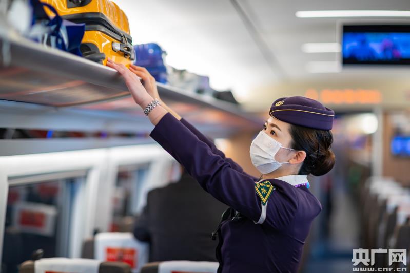 上海客運段值乘的G22次列車上,乘務人員在整理行李架上的物品。 (央廣網(wǎng)發(fā) 李忱攝)