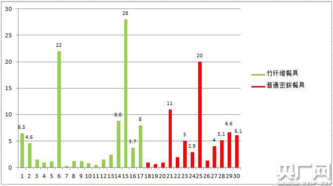 表一 4%乙酸環(huán)境下竹纖維餐具與普通密胺餐具部分測試指標(biāo)和數(shù)據(jù)對比