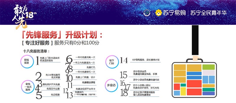 具體來看包括:針對(duì)蘇寧線上線下購買產(chǎn)品,可享免費(fèi)上門取件退換貨,極速退款服務(wù)。針對(duì)門店購物方面,將有VIP金牌導(dǎo)購服務(wù)、店長(zhǎng)接待計(jì)劃。針對(duì)家電細(xì)分領(lǐng)域,將推出免3米管線費(fèi)用、免高空作業(yè)費(fèi)、一年之內(nèi)免費(fèi)清洗一次、免費(fèi)打孔;免費(fèi)上門測(cè)量、設(shè)計(jì)、調(diào)試;免費(fèi)換機(jī)(一年內(nèi)有任何質(zhì)量問題,只換不修)等服務(wù)。在多業(yè)態(tài)方面,蘇寧百貨會(huì)員免費(fèi)清洗黃金飾品、手表;蘇寧小店會(huì)員可享免費(fèi)快遞代收,小店暖心驛站將為前線的快遞小哥、安裝維修工等群體,提供免費(fèi)微波爐使用、手機(jī)充電等;蘇寧紅孩子免費(fèi)育嬰師服務(wù),嬰兒到店免費(fèi)理發(fā)。