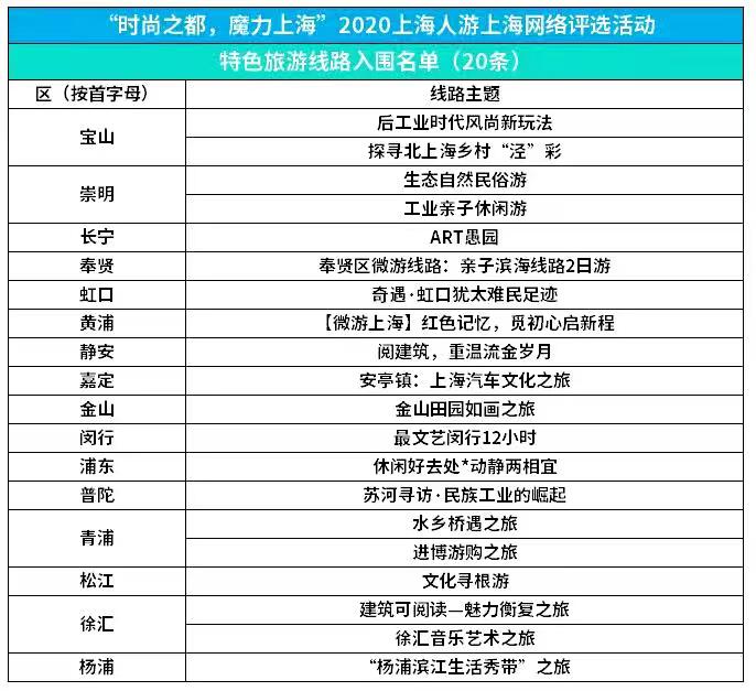 活動(dòng)自11月9日上線以來,受到了廣大市民及企業(yè)單位的踴躍參與,截止到今日,平臺(tái)已累計(jì)上傳線路300余條、活動(dòng)200余個(gè),累計(jì)點(diǎn)贊數(shù)超百萬(wàn)。經(jīng)文旅專家反復(fù)斟酌后精選出20條特色旅游線路和20個(gè)城市好活動(dòng),這些入圍的線路及活動(dòng)將在今年12月份由各區(qū)文旅局委派代表參與線下演講,闡述所在區(qū)的特色線路與活動(dòng)。最終由媒體評(píng)審團(tuán)評(píng)選出2020年度“上海市民最喜歡的微游上海特色旅游線路”和“最受上海市民歡迎的城市好活動(dòng)”。
