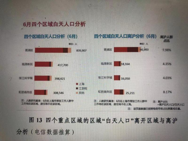 再以本市的四大重點區(qū)域為例,通過6月份電信數(shù)據(jù)推算,不在這些區(qū)域生活而僅在這些區(qū)域工作的“白天人口”均有數(shù)十萬人,多的超過80萬人。其中,虹橋商務(wù)區(qū)、長三角一體化示范區(qū)的“白天人口”中甚至有8%左右是跨省通勤的。