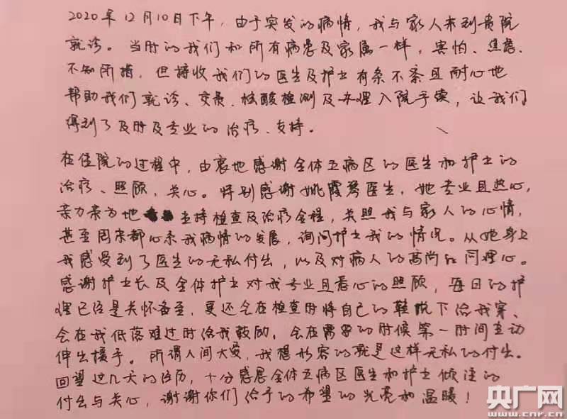 12月16日,一婦嬰西院產(chǎn)科五病區(qū)收到一封來自患者小妍(化名)的感謝信,言辭懇切!懊咳盏淖o(hù)理已經(jīng)是關(guān)懷備至,還會(huì)在檢查時(shí)將自己的鞋脫下來給我穿,會(huì)在我低落難過時(shí)給我鼓勵(lì),會(huì)在需要的時(shí)候第一時(shí)間主動(dòng)伸出援手。所謂人間大愛,我想形容的就是這樣無(wú)私的付出!