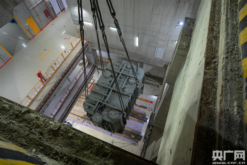在此之后,當(dāng)天的作業(yè)內(nèi)容由地面轉(zhuǎn)入地下。施工人員將吊裝到設(shè)備層的主變壓器架在軌道上,并使用液壓裝置將其緩慢平移直到推入艙位,這一過程需要7-8個(gè)小時(shí)。