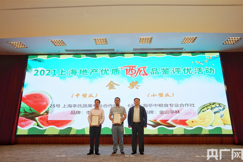 上海亭中糧食專業(yè)合作社獲得小西瓜品鑒評(píng)優(yōu)金獎(jiǎng)。上海李氏蔬果專業(yè)合作社獲得中西瓜品鑒評(píng)優(yōu)金獎(jiǎng)。上海市農(nóng)業(yè)農(nóng)村委員會(huì)黨組成員、副主任葉軍平為金獎(jiǎng)獲得單位頒獎(jiǎng)。