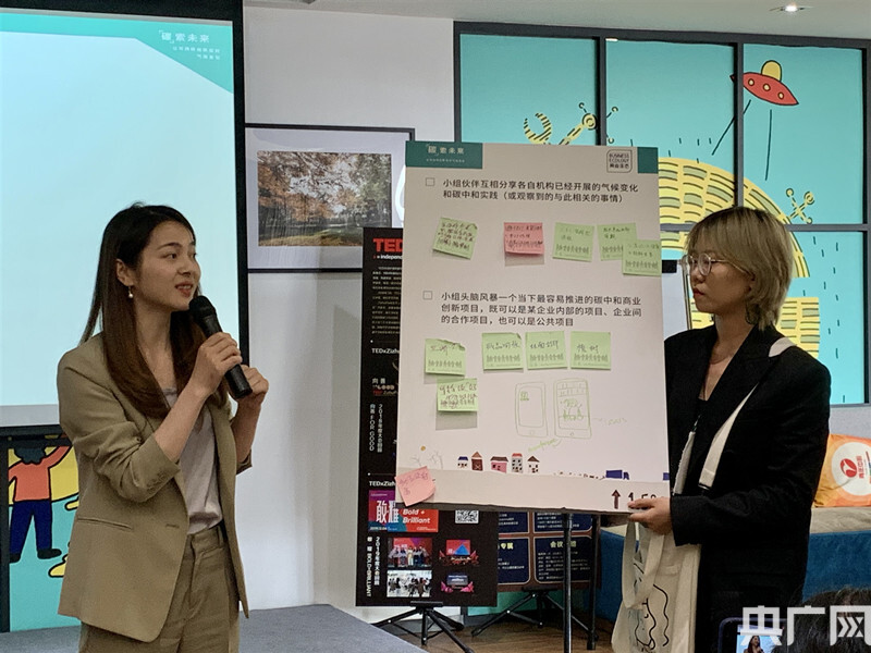 工作坊討論環(huán)節(jié),參與者分組頭腦風(fēng)暴一個具有落地性的碳中和商業(yè)創(chuàng)新項(xiàng)目,現(xiàn)場討論氣氛熱烈。有的小組提出了長江入?谀迪狆B(yǎng)殖項(xiàng)目,通過親子教育和社區(qū)活動提升公眾參與,出售碳信用等方式,創(chuàng)造社會、環(huán)境和經(jīng)濟(jì)三重價值,撬動人們關(guān)注海洋固碳能力。有的小組提出建設(shè)好物推薦平臺,人們可以通過該平臺找到自己需要的氣候友好的產(chǎn)品和服務(wù),用消費(fèi)支持可持續(xù)發(fā)展。還有的小組以其中一個參與者所在的企業(yè)需求為基礎(chǔ),共創(chuàng)了汽車后市場玻璃水小瓶換大瓶的包裝減量改進(jìn)方案,F(xiàn)場參與者還熱烈地討論了軟塑料包裝與硬塑料包裝的選擇問題。