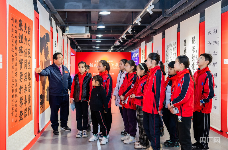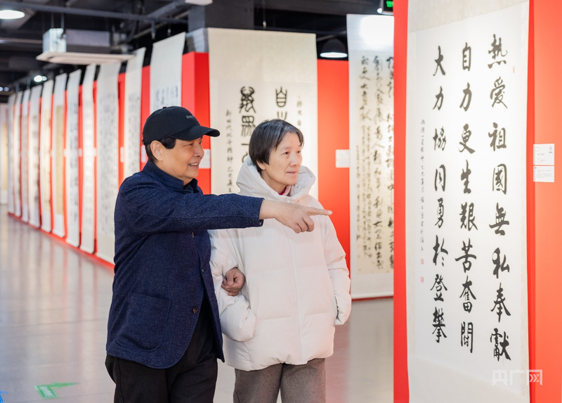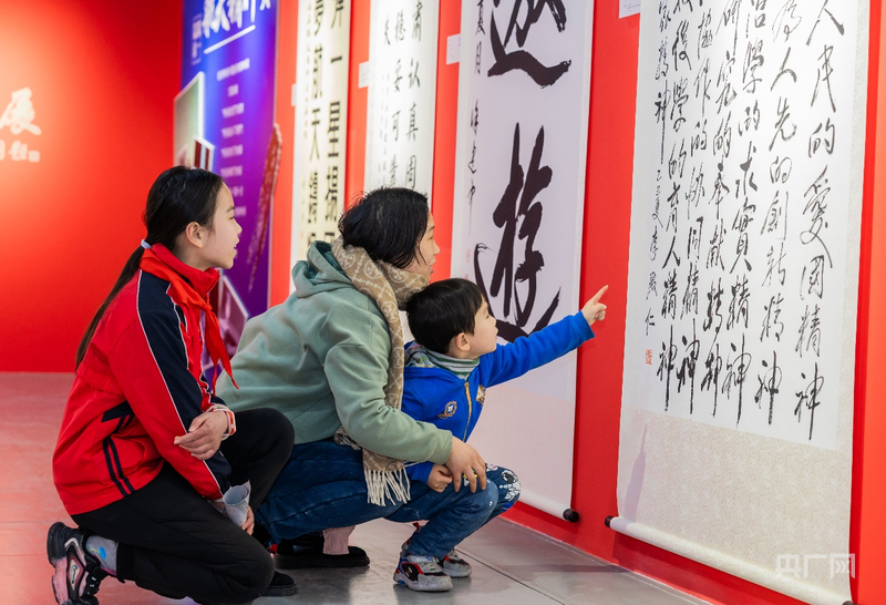 現(xiàn)場可見,一位媽媽帶著兩個孩子蹲在一幅《科學(xué)家精神》作品前進行講解,身著藍色外套的男孩伸手指向展墻上的草書字跡,身旁穿著校服的女孩安靜凝視,一家人一同感受書法藝術(shù)的魅力與航天精神的厚重。