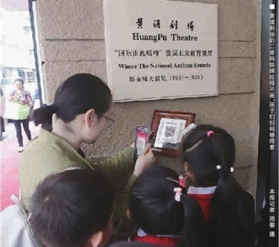 “劇場里紀(jì)念活動結(jié)束,孩子們一出來,掃掃墻上的二維碼,就能知道黃浦劇場的光輝歷史!蹦暇〇|路街道工作人員林潔說,二維碼銘牌掛得不高,孩子們掃碼夠得著。