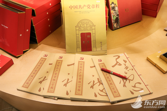 走進(jìn)店鋪,左手邊的樹形展柜擺放著紅色文創(chuàng)系列,今年是新中國成立70周年,開店的首場活動以“中國紅、初心紅”為主題!皹涞吕铩薄俺跣募t”筆記本、《中國共產(chǎn)黨章程(楷書字帖)》、石庫門U盤、“上海解放70周年”膠帶等產(chǎn)品既體現(xiàn)“紅色文化”,又激發(fā)紅色動能!凹t撲撲的”產(chǎn)品視覺上格外喜慶。