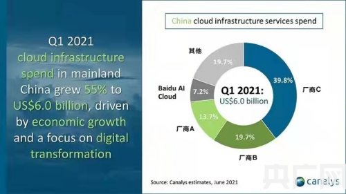 canalys報告顯示,在2021年第一季度,中國云計算市場規(guī)模達到60億美元,同比增長55%,占全球14%,是僅次于美國的全球第二大云計算市場。其中,百度智能云等四家云服務(wù)廠商合計市場份額超過80%。