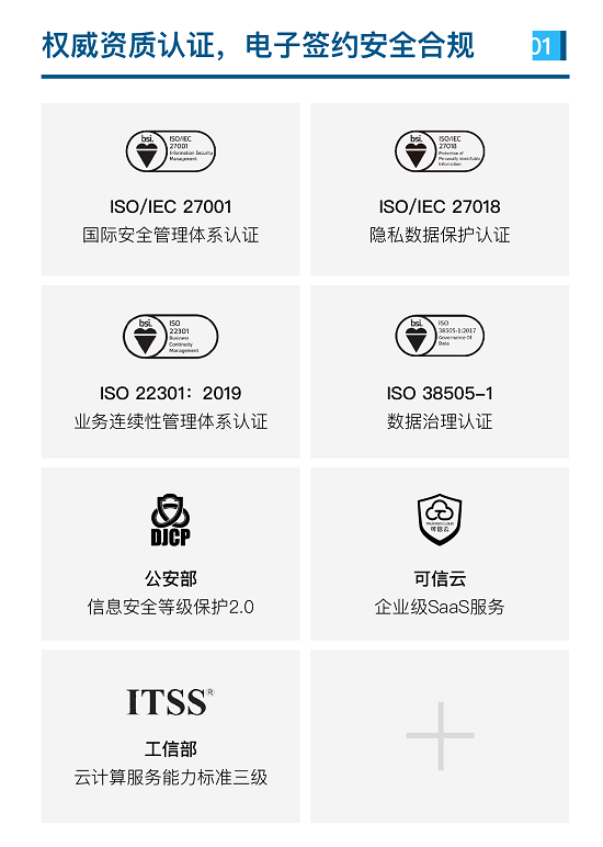 上上簽電子簽約將安全合規(guī)與標(biāo)準(zhǔn)遵從融入產(chǎn)品設(shè)計(jì)與安全運(yùn)營(yíng),持續(xù)優(yōu)化整體安全能力和業(yè)務(wù)保護(hù)水平。據(jù)安全白皮書披露,至目前為止,上上簽電子簽約于行業(yè)內(nèi)率先獲得ISO27001國(guó)際安全認(rèn)證、ISO27018隱私數(shù)據(jù)保護(hù)認(rèn)證、公安部“信息安全等級(jí)保護(hù)三級(jí)”認(rèn)證、工信部“可信云服務(wù)”認(rèn)證、工信部“云計(jì)算服務(wù)能力標(biāo)準(zhǔn)符合性評(píng)估三級(jí)”認(rèn)證、“ISO 22301:2019業(yè)務(wù)連續(xù)性管理體系”認(rèn)證,并獲得“英國(guó)BSI協(xié)會(huì)頒發(fā)的全球首張ISO38505-1數(shù)據(jù)治理”認(rèn)證證書,以七大全球權(quán)威安全資質(zhì)推動(dòng)行業(yè)安全技術(shù)門檻不斷提升。
