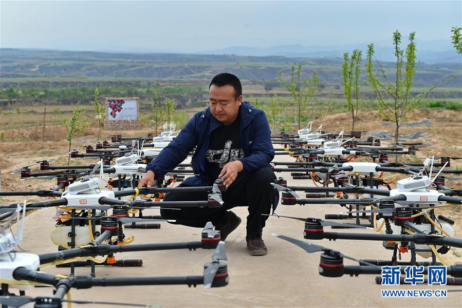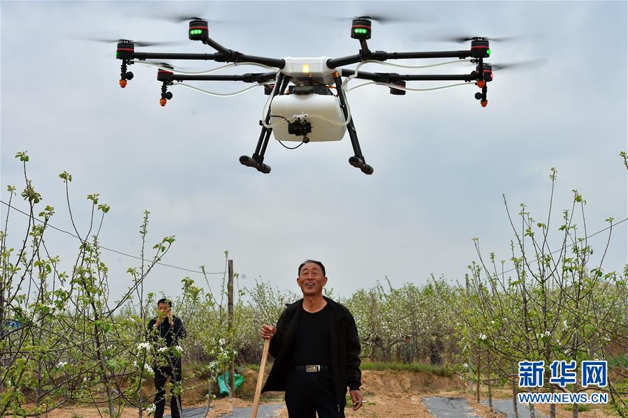 4月25日,在山西省臨汾市吉縣柏山寺鄉(xiāng)西嶺村,一位農(nóng)民觀察飛過自家果園的植保服務(wù)無人機(jī)。 -