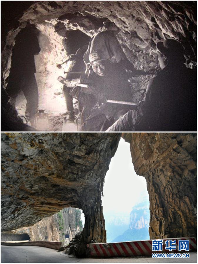 拼版照片:上圖為山西省長(zhǎng)治市平順縣神龍灣村村民在修建掛壁公路(資料照片);下圖為山西省長(zhǎng)治市平順縣神龍灣掛壁公路(6月13日新華社記者曹陽(yáng)攝)。新華社記者 曹陽(yáng) 攝 -