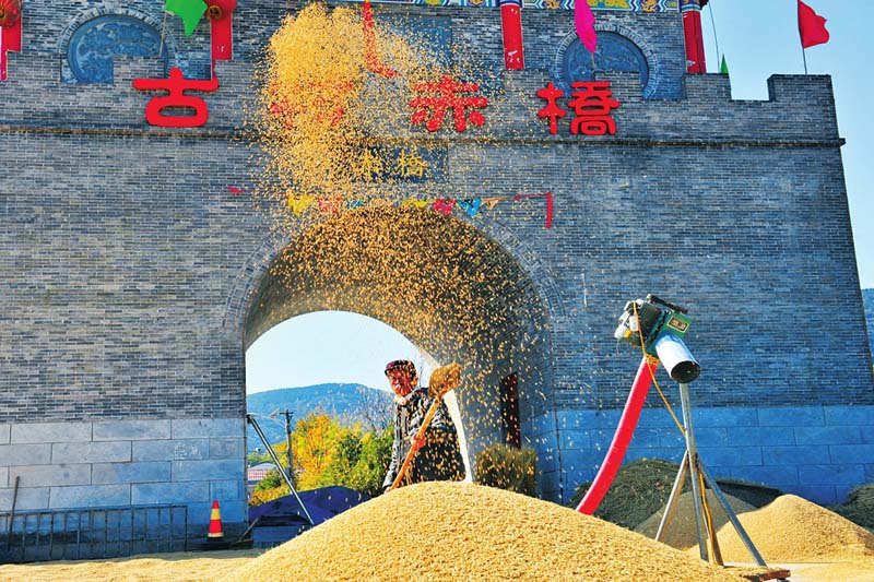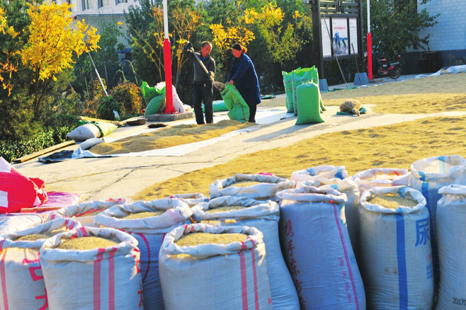 赤橋村村頭,金秋稻米打場成為古村一景。
