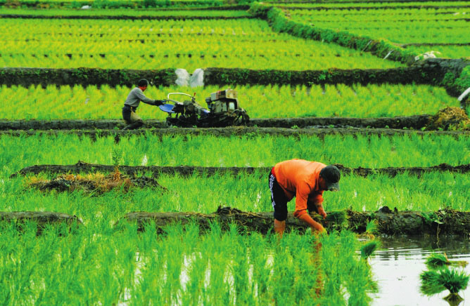春播時節(jié),村民勞作在地頭,放眼望去波光粼粼、稻禾茵茵。