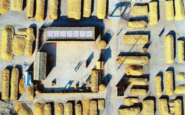 1月17日,俯瞰昔陽(yáng)縣閆莊鄉(xiāng)閆莊村,豐收廣場(chǎng)格外醒目。為進(jìn)一步挖掘旅游資源,閆莊鄉(xiāng)別出心裁,在閆莊村口18余畝的玉米堆場(chǎng)上用10余萬(wàn)穗、2萬(wàn)余公斤玉米,打造出一個(gè)別具特色的豐收廣場(chǎng),
