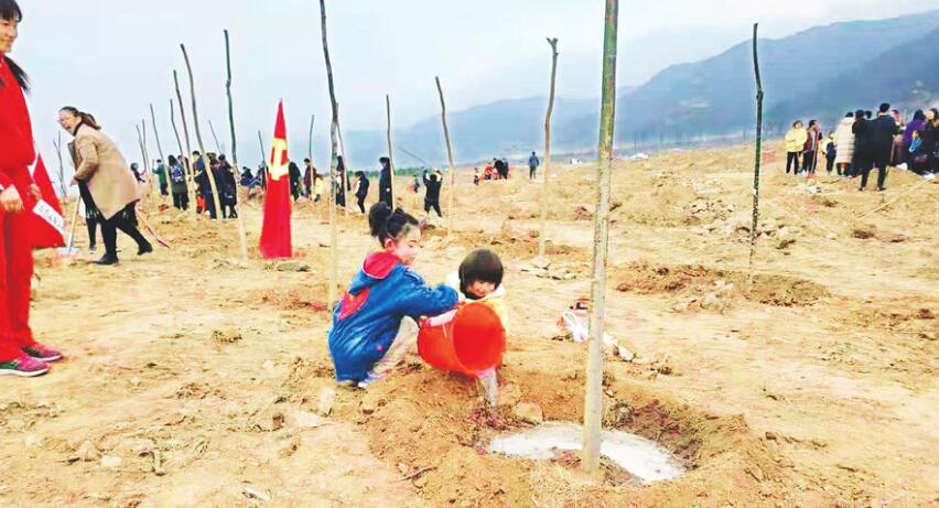 在第41個植樹節(jié)到來之際,各地紛紛組織植樹活動,為大自然增添新綠。圖為兩名小朋友正在運城市鹽湖區(qū)義務(wù)植樹基地為剛栽種的樹苗澆水。(山西日報通訊員 攝)