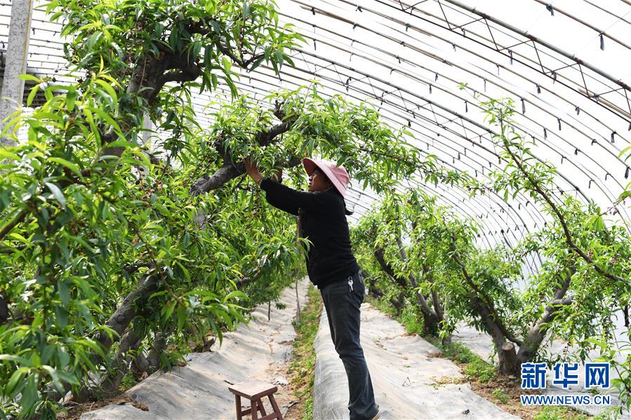3月19日,在稷山縣清河鎮(zhèn)荊莊村的稷山縣愛民桃樹種植基地內(nèi),工作人員在管護(hù)油桃樹。